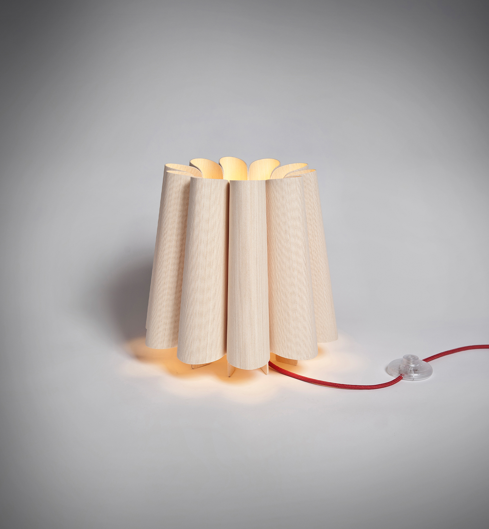 Our acoustic lamps are designed with carefully selected materials, wool felt and wood veneer, which are known for their sound-absorbing properties. The innovative design incorporates parabolic fins, folded and mounted to maximize surface area, which enhances the absorption of sound waves. The felt, with its porous texture, traps sound energy, while the wood veneer adds a layer of diffusive properties.